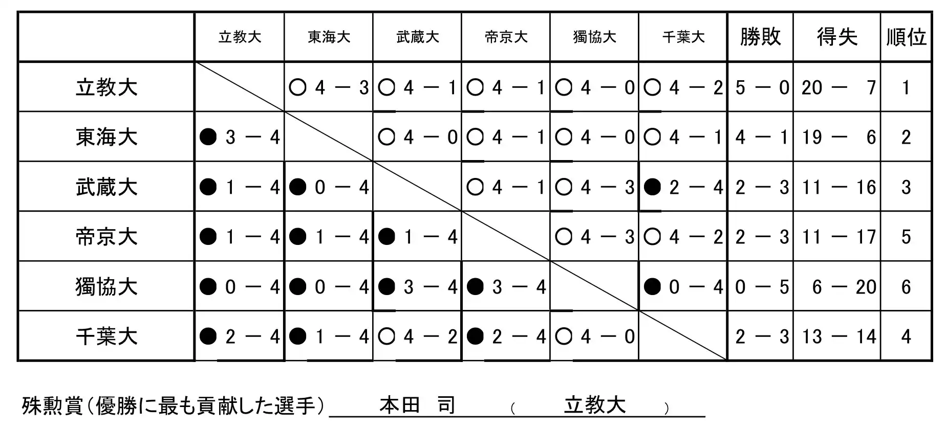 男子部は9月11日〜9月12日に獨協大学にて、2025年秋季関東学生卓球リーグ戦3部Aブロックが行われ、立教大学はブロック優勝となり、春・秋リーグ戦連覇は41年ぶりの快挙となりました。リーグ戦殊勲賞は本田司 (スポウェル・3年)です。