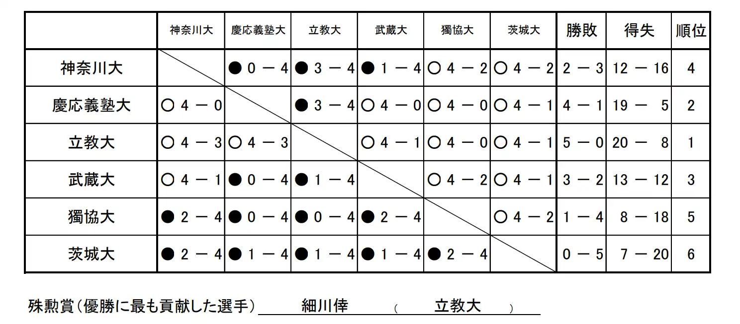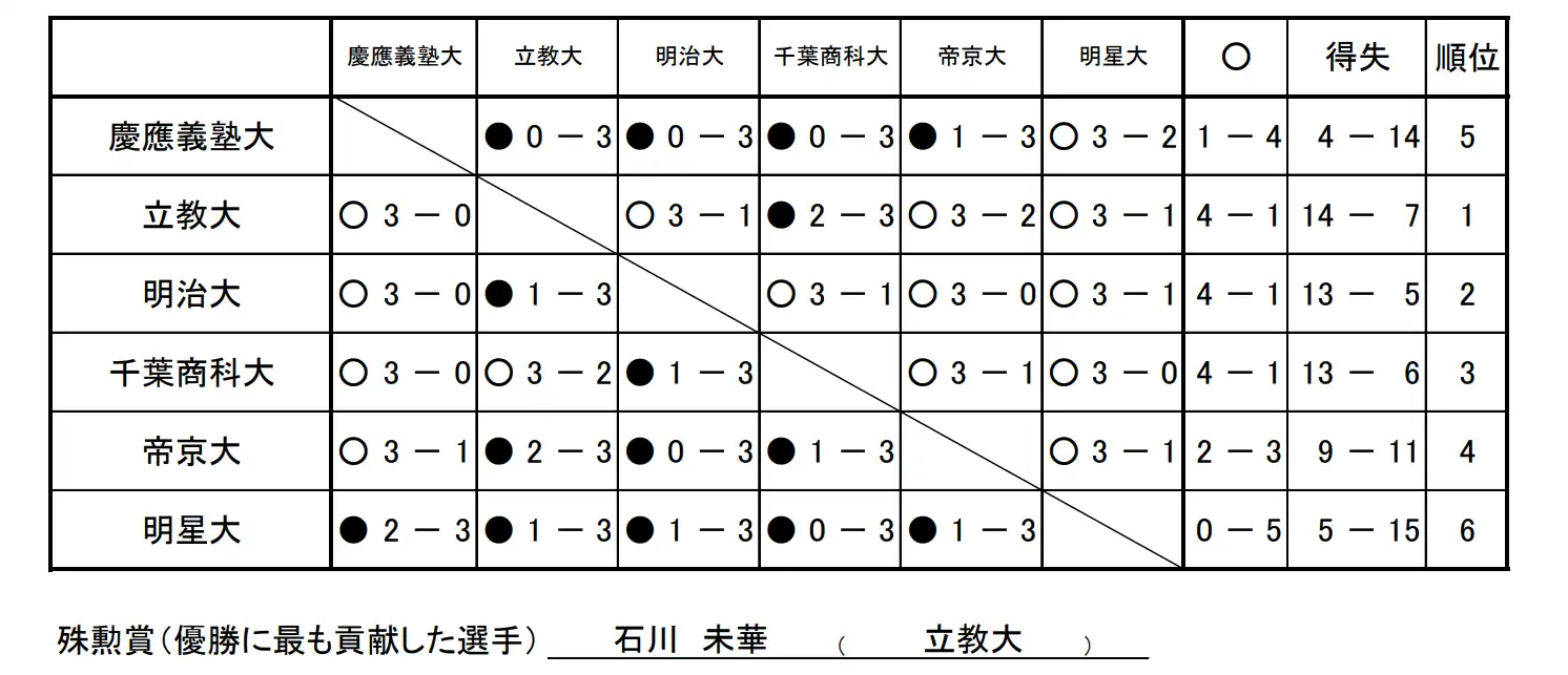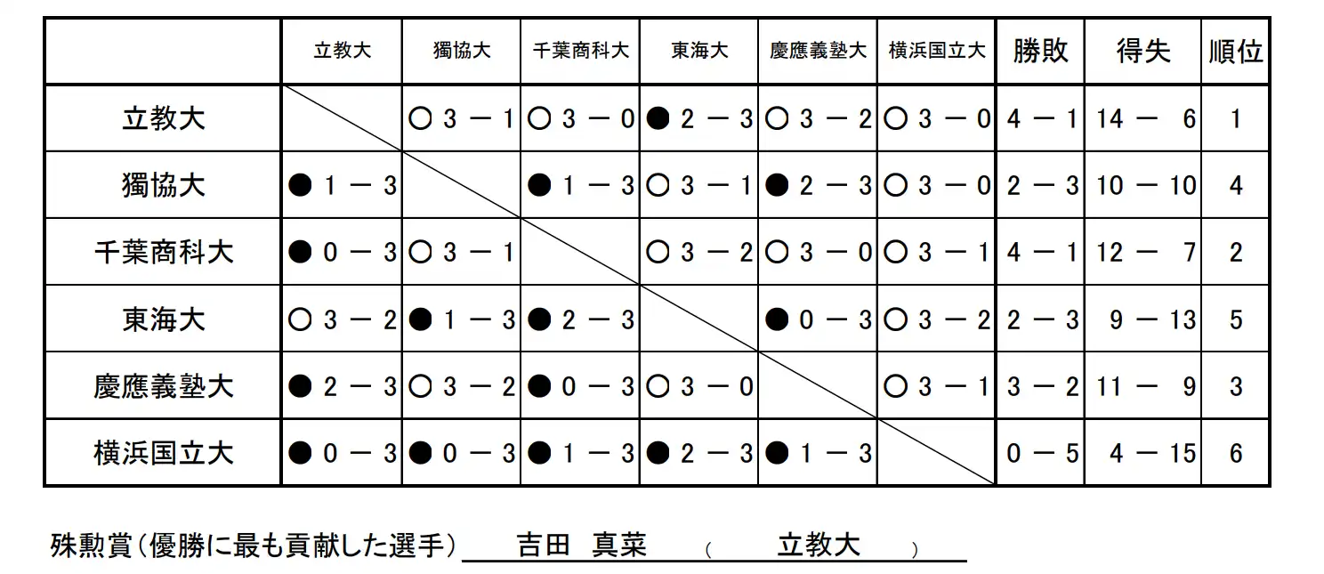 男子部は5月2日、5月3日に獨協大学にて、2025年春季関東学生卓球リーグ戦3部Aブロックが行われ、立教大学は41年ぶりのブロック優勝となりました。リーグ戦殊勲賞は細川倖 (スポウェル・3年)です。