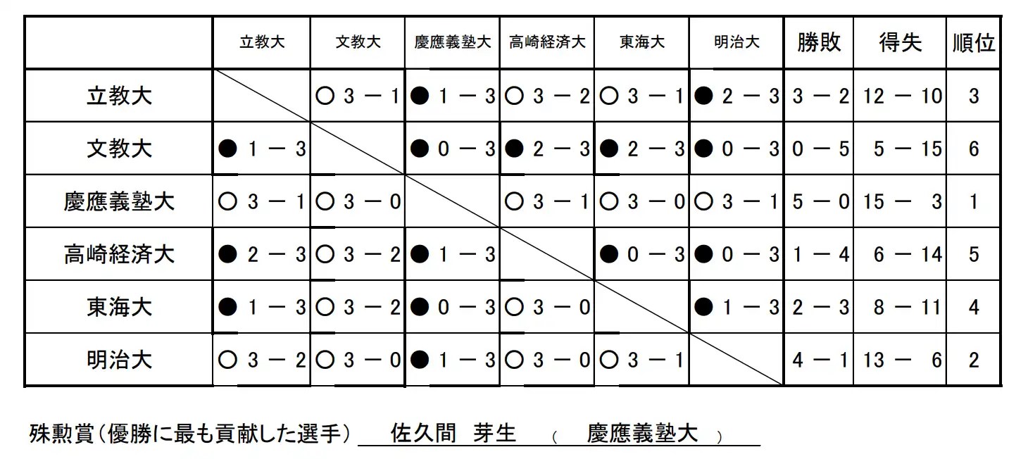 10月4日に駒沢体育館にて3部優勝決定戦が行われ、立教大学は東京経済大学に2-4で敗退となりました。